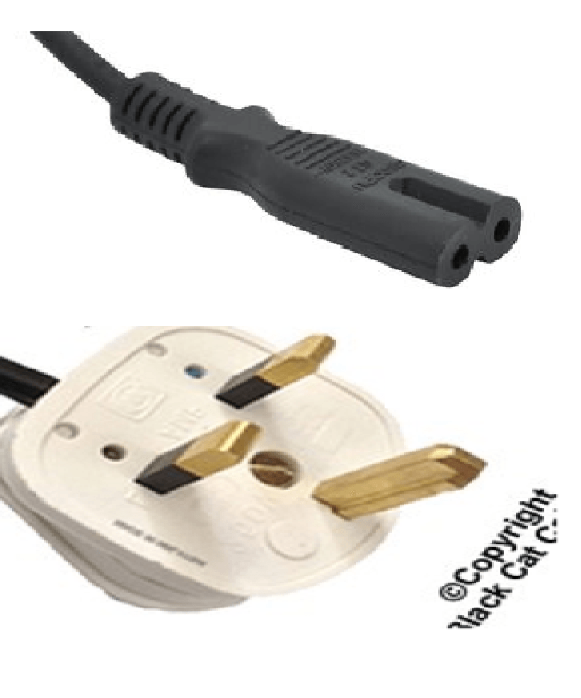 - Fully Moulded UK Plug - IEC C7 (Fig 8) , Colour: Black , Rated at 3amp